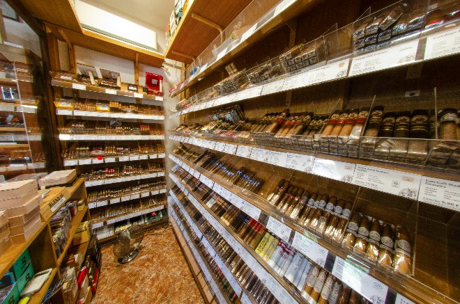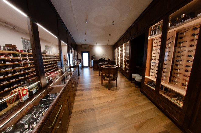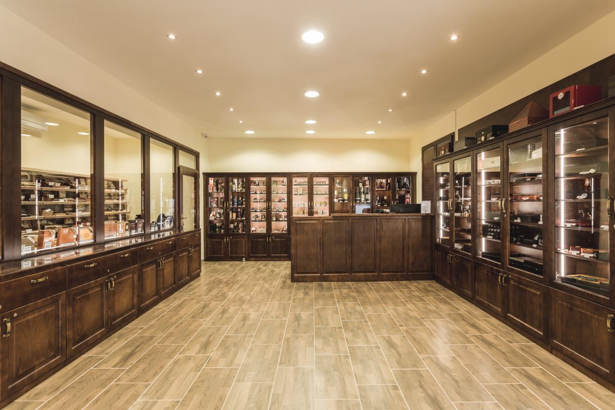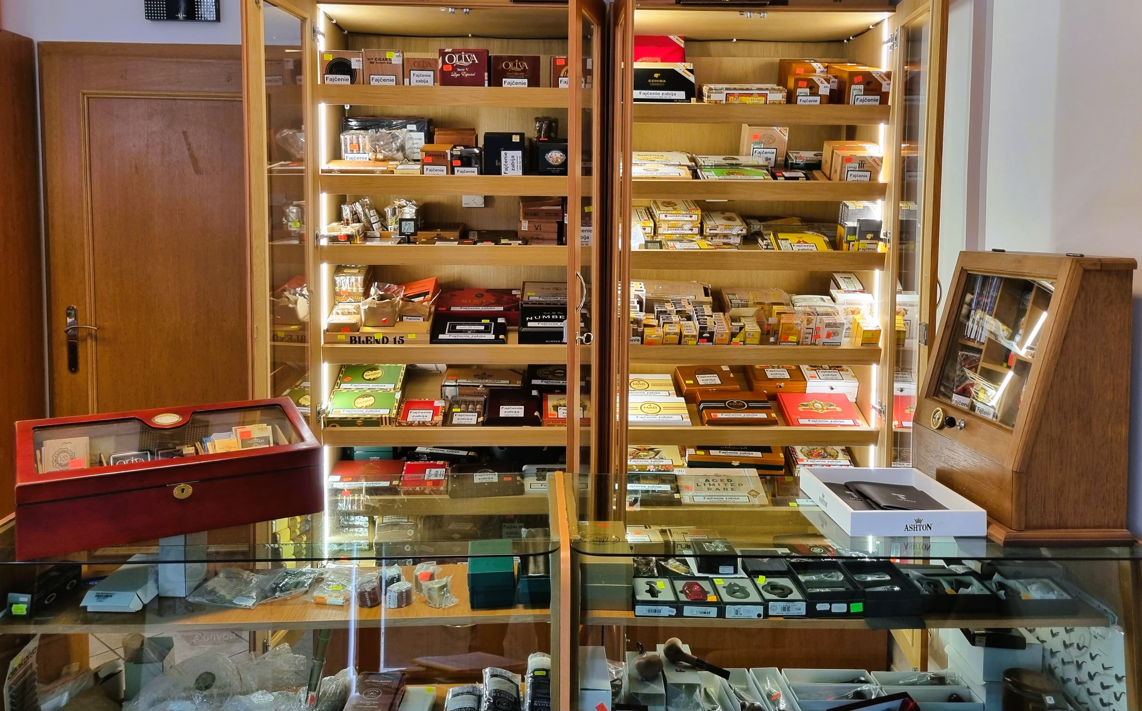 Krásna priestranná predajňa s veľkým walk-in humidorom, skvelým výberom príslušenstva, fajok a fajkového tabaku. Na skok od centra a blízko letných terás.